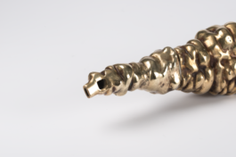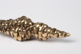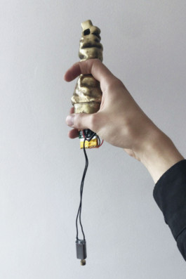 This object is a designed instrument for being a part of the fictive tribe’s ritual ceremony. When a performer blows the mouthpiece, a sensor activates a motor and synthesizer.
